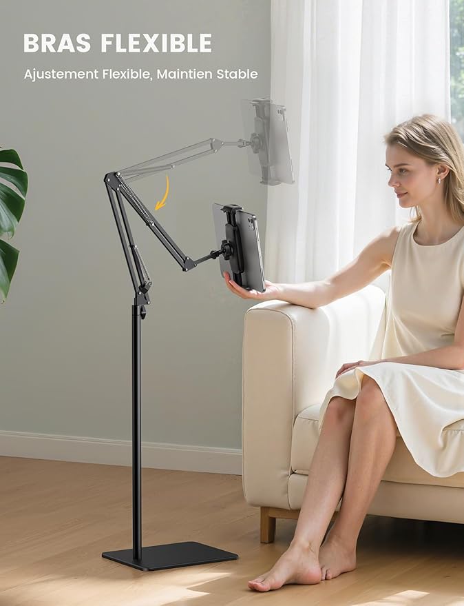 Keep your tablet at the perfect viewing position with this fully adjustable Floor Tablet Stand. Designed for comfort, stability, and versatility, it features adjustable height and angle settings, along with a 360° rotating holder to fit any viewing need. Whether you're working, presenting, watching videos, or following online classes, this stand offers hands-free convenience with exceptional durability.