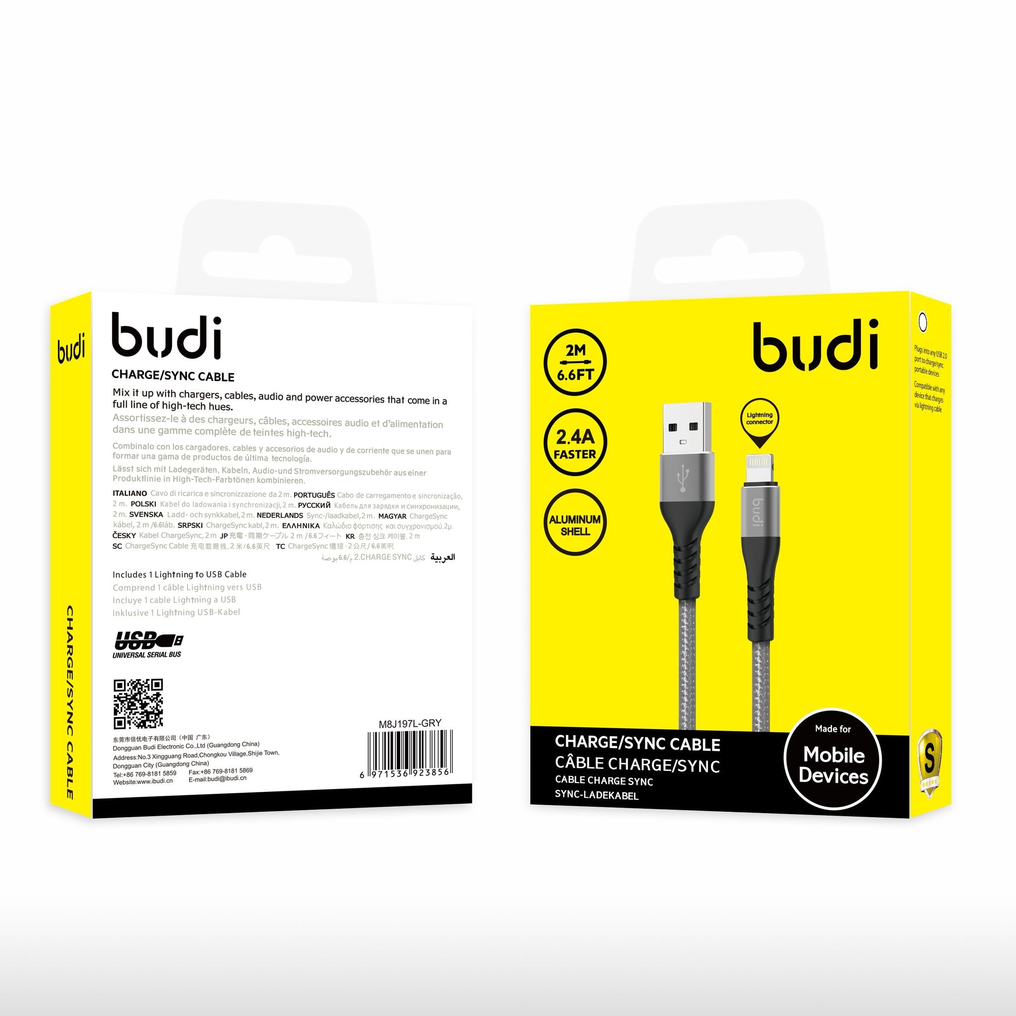 The Budi 2-meter USB to L-shaped Braided Cable delivers fast and reliable charging for smartphones, tablets, and other USB devices. Its L-shaped connector design prevents bending stress, while the durable braided exterior ensures long-lasting performance.