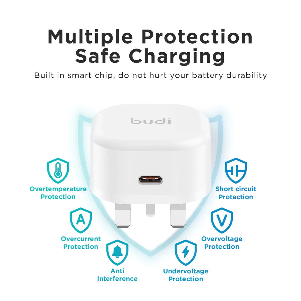 Charge your devices quickly and safely with the BUDI Type-C 20W PD Fast Charger.