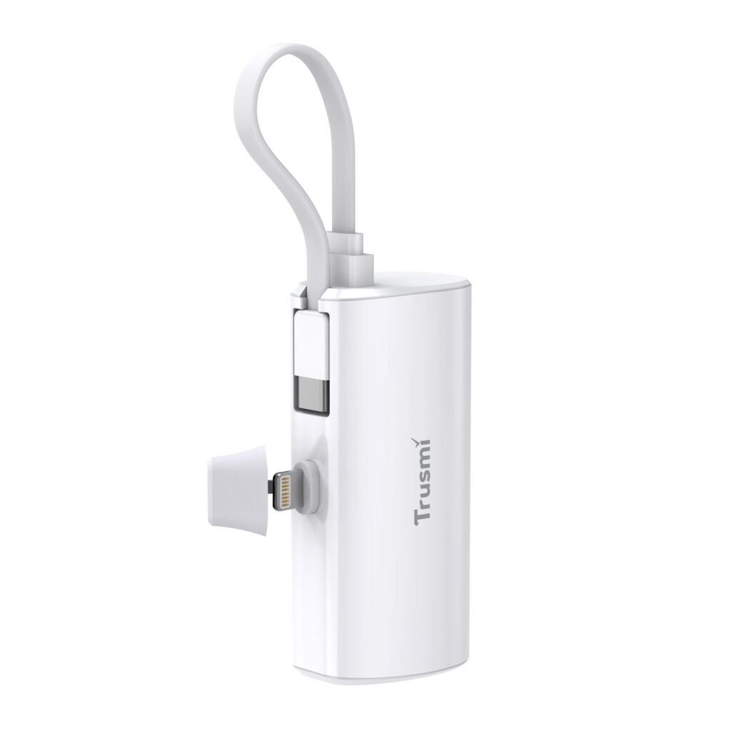 Trusmi PB16-02 Batterie Externe 5000 mAh – Power Bank Portable 5V/2,1A avec Support pour Câble Lightning & USB-C – Blanc